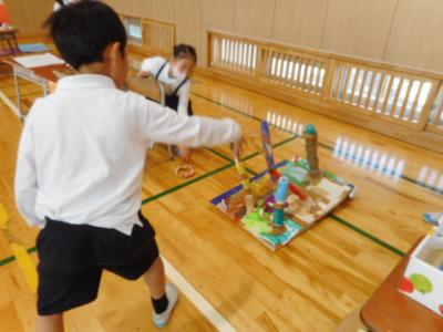 2年生が1年生を招待し「おもちゃランド」を開きました。生活科の学習です。「金魚すくい」「的あて」「UFOキャッチャー」「輪投げ」「魚釣り」「アーチェリー」など、2年生が工夫を凝らしたコーナーがたくさん並びました。1年生は歓声を上げておもちゃランドを楽しむことができました。みんなが笑顔になれるとても素敵な学習になりました。