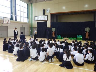 1・2年生を対象に感性のびのび体験推進事業を実施しました。内容はステージアウラの皆さんによる人形劇「ネズミの恩返し」です。ユーモアあふれる言い回しや身振りに引き込まれ、思わず声を上げて反応・応援するシーンが多々見られました。鑑賞後は感想を発表することもできました。豊かな感性を育む素敵な機会になりました。ステージアウラの皆さん本日は誠にありがとうございました。