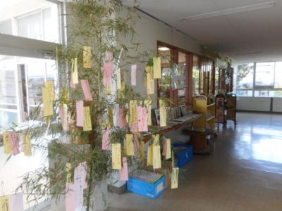 7月になりました。今日の天気は快晴。本格的な暑さを感じる一日です。校内には「7月だなあ」と感じるものがいっぱいです。図書館前の七夕飾りには「ピアノが上手になりたい」など、たくさんの短冊に微笑ましい願いが込められています。2年生が生活科で栽培しているミニトマトは収穫の時期を迎えました。いよいよ夏本番ですね。