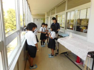 水泳シーズンの締めくくりに6年生が着衣水泳に取り組みました。クレインプールの指導員を講師としてお招きし、自らの命を守る学習に取り組みました。写真はペットボトルを使った背浮きや、岸からはねれた要救助者に対してペットボトルを投げ入れる実習を行っている場面です。水遊びは大変楽しいものですが、水は時に大変怖いものにも変わります。夏休みを前に危機管理の意識を高めることができたのではないでしょうか。