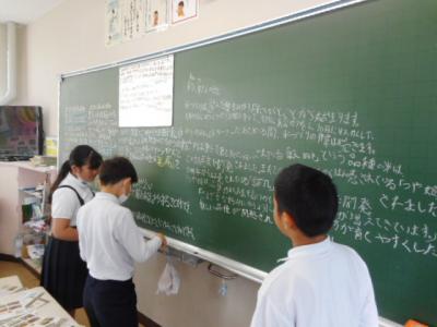 5年生の社会科の授業のワンシーンです。「米作りについて調べる」という共通の課題はありますが、子どもたちが班ごとに、何をどのように調べるかを選択して取り組んでいます。もちろんそれぞれの勝手な学びではなく、友達と相談したり協力したりしながら進めます。タブレットも必要に応じて活用します。5年生にきいてみると、「このような授業は楽しいと」のことでした。新しい授業のスタイルとして他の学級や学年でも取り入れていきたいと考えています。