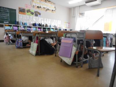 今日はシェイクアウトいしかわに参加し、地震の避難訓練を行いました。緊急地震速報を聞いて机に身を隠します。「しゃがむ」「かくれる」「じっとする」の行動がしっかりとれたようです。また、隠れる場所は、物が「落ちてこない」「倒れてこない」「動いてこない」場所がよいことも学びました。自分の命は自分で守る。命を大切にできる松任小にしていきましょう。