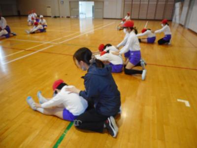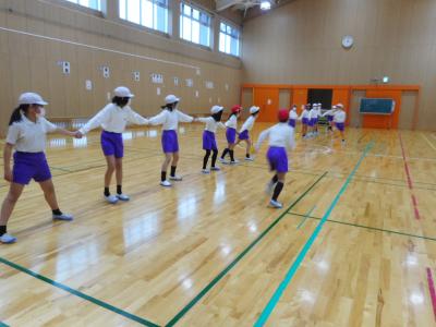 柔軟性を高める運動に取り組む子どもたち。さすがの柔らかさです。一方、工夫されたルールで回旋リレーを楽しむ子どもたち。楽しい体育の授業を通して、運動好きな子供になってほしいと思います。健康な体を作ろう!