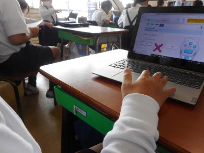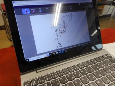 タブレットを使った社会科の授業です。ここが日本というところを赤で囲む活動を通して、領土を理解するというねらいです。タブレットのいいところの一つとして、やり直しができることが挙げられます。じっくり考えて、何度も線を書き直すシーンが見られました。試行錯誤。勉強にはとても大切なことですね。