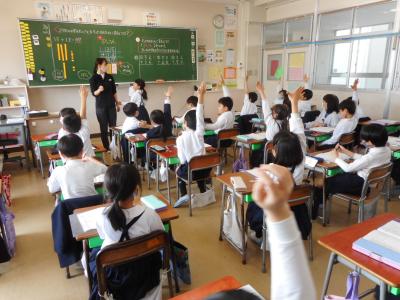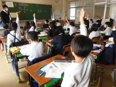 3年生の社会と2年生の算数の授業の様子です。3年生は方位磁針と教室から見える風景をもとに地図の東西南北を考える活動です。2年生は2ケタ同士のたし算の筆算の問題に取り組んでいました。先生が発表を促すと、元気な声とともにたくさんの手が挙がりました。校長先生はとてもうれしくなりました。「進んで考え表現する」ことはとても大切ですね。