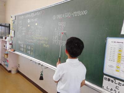 かけ算の筆算の仕方についての学び合いが進められています。ある子が指示棒を持って簡潔に説明しています。でも、ここで終わりません。聞いているこどもたちに対して先生は「つなげて説明できますか?」。また、ある子の「そういうことか!」の声に「そういうことってどういうことか言えますか?」と問い返します。子どもたちは、説明をつなぎ、深い理解、全員の理解に向かっていきました。笑いも起こる和やかな雰囲気の中、素敵な学び合いが見られました。