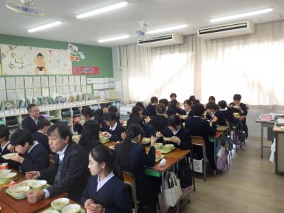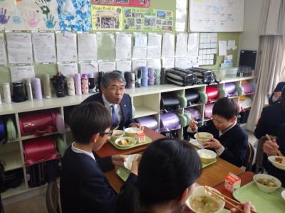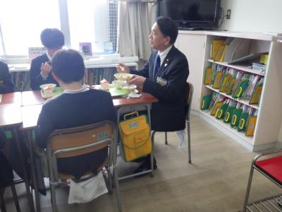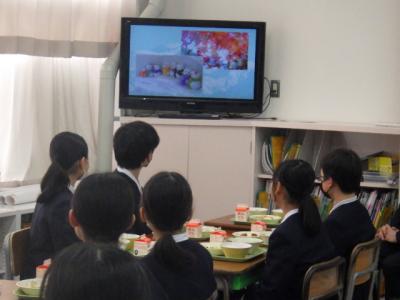 白山市誕生21周年を記念し、白山市内各校では本日、白山市お誕生日給食を行っています。本校には、田村市長様、清水教育長様をはじめ、たくさんの皆様の訪問をいただき、食育動画の公開と給食試食会が行われました。食育の動画は「白山の畑からいただきます~すがたを変える大豆~」など地元特産物の魅力を紹介するものです。制作に関わった皆様と一緒に、全校で動画を見た後、4・6年生が一緒に給食を食べました。「おかえり鮭のフライ」「白山ジオ豚汁」など最高に美味しい給食でした。