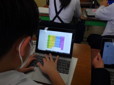 2年生の算数では今かけ算を学んでいます。今日はL字型に並んだドットの個数の求め方について学びました。端末を使い自分の考えを送ります。発表も上手にできました。九九の学習はこれから続く算数の基本中の基本です。九九ボランティアの方を招いての学習も予定しています。がんばれ2年生!