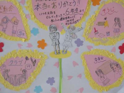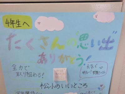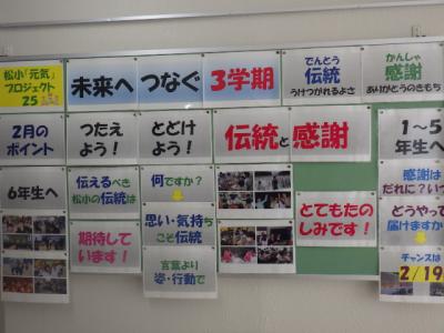 松小元気プロジェクトの2月のポイントは「伝えよう!届けよう!~伝統と感謝~」です。2月19日に迫った「6年生を送る会」を前に、校舎に感謝を伝えるメッセージがあふれ出しました。1~5年生から6年生へ、6年生から1~5年生へ、温かい気持ちを伝え合っています。子ども達が考えて進めている取組です。いいですね松小!