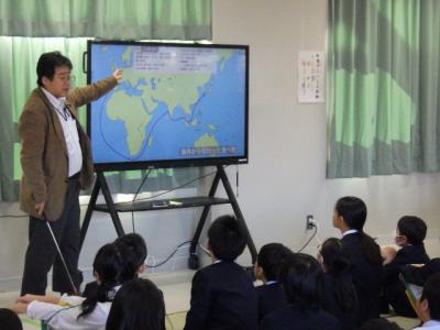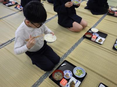 12月9日(水)、5年生を対象に「和食のしつらえ」の授業を行いました。給食食器製造の最大手である「三信化工(東京都に本社)」様より、社長の増田様と講師の海老原様にお越しいただき、和食器に関するお話を聞きました。模様に込められた意味や気持ちを考えることなどを通して、日本や海外の文化のよさに共感し取り入れる大切さを知ることができました。海老原様の語りと興味深い内容に、5年生の子どもたちは引きこまれるように話を聞いていました。お話の後、5年1組が代表して、和食器に盛り付けられた給食を、和の空間で味わう、「和食のしつらえ」を体験できました。お話を伺うと石川県で児童相手に授業を行うのは本校が初めてとのことでした。貴重な食育の機会となりました。本当にありがとうございました。
