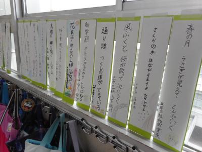 以前にも紹介しましたが、松任小では俳句作りに取り組んでいます。背景に絵を加えて短冊に仕上げました。もう一枚の写真は5年生の音楽で作曲に取り組んでいる写真です。「楽しいですか?」と尋ねると「楽しいです」と答えが返ってきました。創作活動に取り組む子どもたちはとても生き生きしています。このような活動を通して豊かな感性を育んでいきたいと思います。