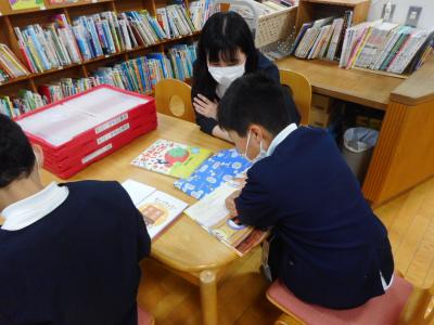 図書館での読書の様子です。先生が見守る中で数冊の本を選び、熱心に読むことができました。読書の楽しさを大切に、図書館利用を促していきたいと思います。