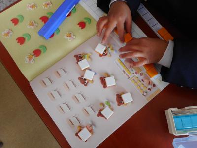 1年生の算数です。くまさんが全員椅子に座ることができるかをブロックを置いて調べています。1対1対応は算数にとって基礎になる考え方であり、1年生では手を動かして物を使って身に付けていきます。「手を使って考える算数=ハンズオン・マス」で、楽しく算数を進めています。
