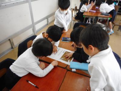 2年生の生活では、1年生に学校を紹介するために、特別教室などのポスター作りを進めています。みんなで知恵を出し合て、作成を分担してと、とても協働的です。グループ学習は楽しいですね。