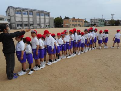 1年生が運動場で体育をしていました。2組はジャングルジムの前に整列。遊具遊びに汗を流しました。3組は鉄棒でつばめのポーズ。バランスよく制止することができました。「もっとしたい!走りたい!」の元気な声が響いていました。