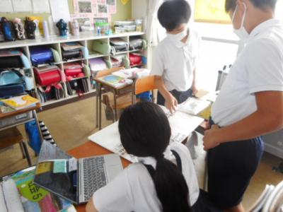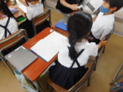 5年生の社会科の授業のワンシーンです。「米作りについて調べる」という共通の課題はありますが、子どもたちが班ごとに、何をどのように調べるかを選択して取り組んでいます。もちろんそれぞれの勝手な学びではなく、友達と相談したり協力したりしながら進めます。タブレットも必要に応じて活用します。5年生にきいてみると、「このような授業は楽しいと」のことでした。新しい授業のスタイルとして他の学級や学年でも取り入れていきたいと考えています。