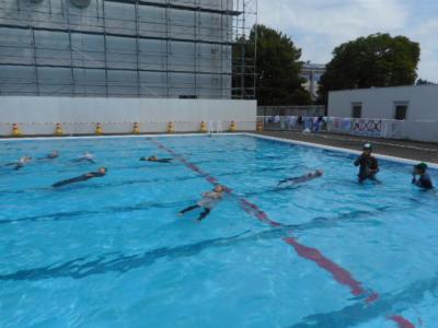 水泳シーズンの締めくくりに6年生が着衣水泳に取り組みました。クレインプールの指導員を講師としてお招きし、自らの命を守る学習に取り組みました。写真はペットボトルを使った背浮きや、岸からはねれた要救助者に対してペットボトルを投げ入れる実習を行っている場面です。水遊びは大変楽しいものですが、水は時に大変怖いものにも変わります。夏休みを前に危機管理の意識を高めることができたのではないでしょうか。