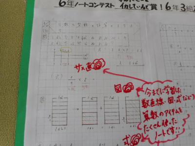 ノートコンテストという取組を行いました。各クラスでよい授業ノートを選んで掲示しました。今回は指導したノートの型を生かすなど丁寧に書き上げているものを中心に選ばれています。「学んだことを生かしているで賞」「根拠を見つけたで賞」「最後まで丁寧で賞」など、担任がそれぞれのよさを価値づけて表彰しました。書く力は大変重要です。学期に一回ずつコンテストに取り組んでいきます。
