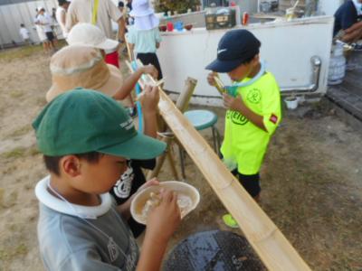 夏休みが始まり2週間ちょっとが過ぎました。灼熱と言ってもよい日々が続いていますが、元気にお過ごしでしょうか。今日は「おやじの会」の皆さんの企画・運営による「校庭キャンプ」が開かれています。お昼すぐに始まったイベントは、「ペットボトルロケットづくり」「流しそうめん」「空き缶炊飯」が行われ、楽しく過ごす様子が見られました。