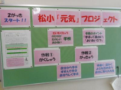 8月30日、長い夏休みが終わり、今日から2学期のスタートです。始業式は熱中症予防のためテレビ放送による式に変更して行いました。2学期は、より「のびのび」「たのしい」「あかるい」学校を目指して、元気を引き出す取組に重点を置きたいと考えています。学習では「自分から、自分らしく学ぶ」ことで学習の面白さを、学級生活では「お互いのよさを認め合い取り入れる」ことでつながりや自己有用感を大切にします。「松小元気プロジェクト」と名付けました。どうか2学期もご支援ご協力をお願いいたします。