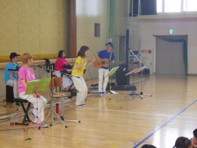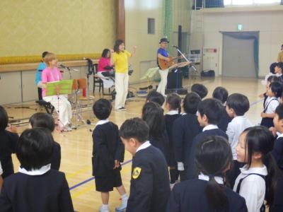 1~3年生を対象に感性のびのびコンサートを行いました。地元の音楽ユニット「ポンポロプー」さんによるコンサートです。子供たちになじみのある童謡やアニメソング。また、朝の歌として合唱している「カントリーロード」や「ビリーブ」、さらには「校歌」まで、たくさんの曲を演奏していただきました。ボーカルの方の呼びかけで、子ども達も大きな声で合唱したり、曲に合わせてダンスをしたりしながら楽しみました。このコンサートは松小元気プロジェクトの一環として、また、感性を育む取組として計画し実施しました。子どもたちはポンポロプーさんから、最高の元気をいただきました。ありがとうございました。