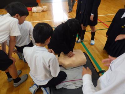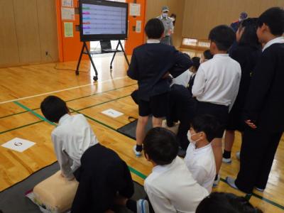 白山消防署の皆さんを講師にお招きし、5年生が救急法について学びました。救急の場に出くわした時にどのようにすればよいのかの基本を学びました。中でも、胸部圧迫による心臓マッサージは、人形を使って、全員が体験できました。有効な圧迫をカウントするアプリによって、関心を高めながらの体験でもありました。救急の場は、人生のどこで出くわすかは予想することができません。小学生からの学びが、命を大切にするという意識と、将来いざというときの行動につながっていくことを願います。消防署の皆さんには分かりやすいご指導をありがとうございました。