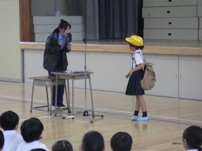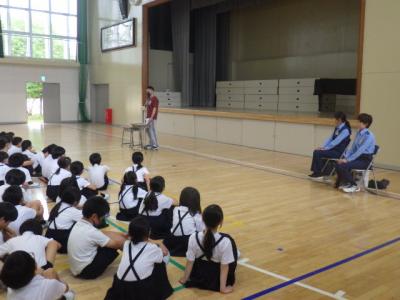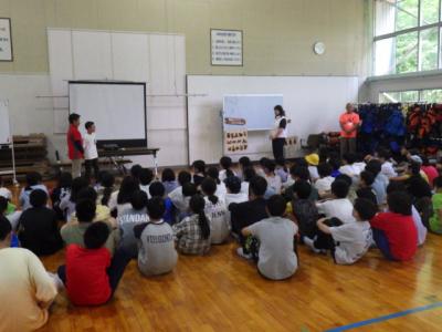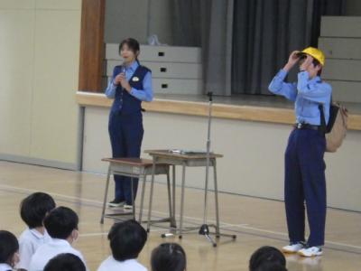 白山警察署の方をお招きし、不審者に出会った時の対応を学ぶ安全集会を行いました。警察の方からは、「いかのおすし」の確認、もしもの時の逃げ方、そして、大声で助けを呼ぶことを教えていただきました。「松任小の元気な声なら悪い人もすぐに逃げていくよ。」と誉めていただきました。自分の命を守ることを真剣に考えられたようです。全体の集会の後は、校内に不審者が侵入した場合の訓練を行いました。鍵をかけたりバリケードを作ること、暗く静かにして隠れることなどを確認できました。