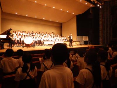 6月19日に行われる白山市音楽会に出場する4年生が、全校の前で合奏と合唱を披露しました。合奏は「上を向いて歩こう」、合唱は「幸せになあれ」です。発表にはたくさんの練習の成果が表れていました。合唱も合奏も大変よく揃っており。また、一人一人の表情からは一生懸命さや自信が伝わってきました。聞いてくれた1~3、5・6年生から、温かい感想やアドバイスが送られました。音楽を通して全校の心が一つになる温かい会でした。4年生皆さん、本番は、さらに満足できる発表になるように頑張ってきてくださいね。