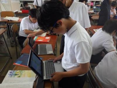 松任小学校では「子ども主体の授業」を目指し研究に取り組んでいます。今日は5年3組で国語科の研究授業を行いました。みんなで作った問題の解決に向けて、一人でじっくり考えたり、友達と学び合ったりします。また、問題への考えやその時間の振り返りを端末に打ち込んでいきます。最後まで集中を切らすことなく、意欲的に学びに向かう姿が大変素敵でした。子供たちに学びを委ねる新しい授業スタイルです。主体的に学ぶ中でどんどん力を付けていってほしいと思います。