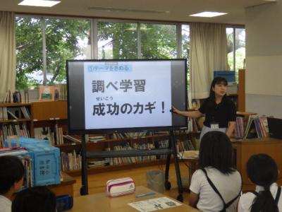 図書館の先生による「調べ学習オリエンテーション」を中・高学年で進めています。調べ学習の流れを「テーマを決める」「予想する」「調べる」「まとめる」の4段階にわけ、それぞれのポイントを教えてもらいました。「テーマ決め」では自分の「はてな」を大事にするなど、調べ学習に挑戦したくなるお話でした。今日のお話の内容を、日々の調べ学習や調べ学習コンクールへの挑戦に活かしてほしいと思います。