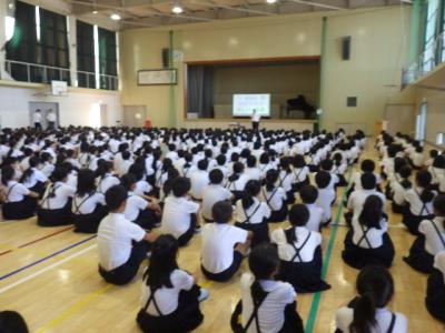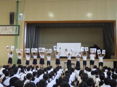 学校に子どもたちが戻ってきました。今日から2学期のスタートです。始業式では「いい声」をテーマに、授業や生活や行事を通して、自分の考えや思いを伝えることの大切さを話しました。生徒指導の先生からは「自分からあいさつ」のお話がありました。あいさつの「いい声」が聞こえてくることを期待しています。始業式の後の児童集会では、運営委員期の皆さんから運総会のスローガン「勝っても負けても思い出に残る運動会にしよう!」が発表されました。2学期も「みんなが元気!みんなで伸びる!」にしていきましょう。
