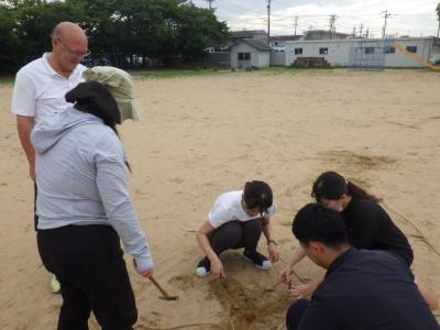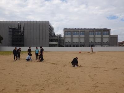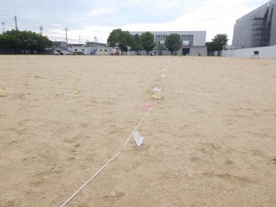 放課後、先生方で運動場に新しいトラックを作りました。改修工事の影響で運動場の一部が使えなくなったため、元の場所からずらす形で、地面にポイントを打ち込み、紐を張っていきます。保体の先生方が中心となって位置やサイズを設定しました。運動会は10月1日です。これから新しいトラックでの練習が始まります。