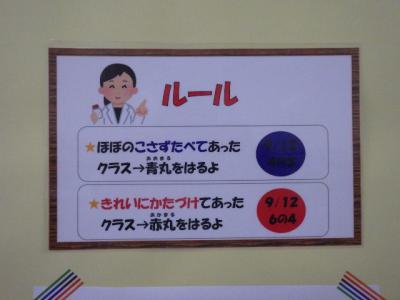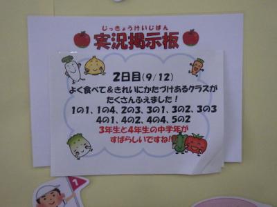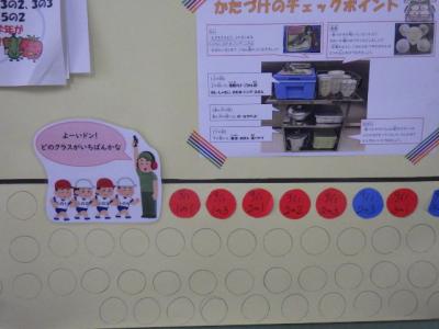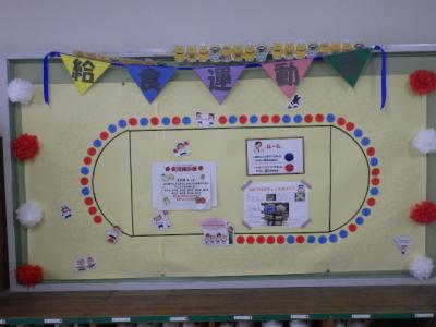 給食運動会の取組を行っています。「残さず食べたクラスには青シール」「きれいに片づけてあったクラスには赤シール」です。取組が始まってまだ2日目ですが、多くのクラスがシールを獲得しています。好き嫌いなくモリモリ食べることで健康を、しっかり片付けることで調理員さんに感謝の思いを、高めていけるといいですね。