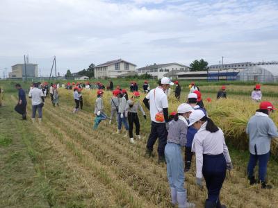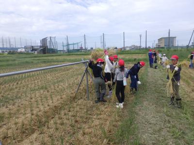 5年生が稲刈り体験を行いました。春に田植えをした翠星高校の田んぼです。良い天気に恵まれ、子ども達は鎌で刈った稲を束にまとめ、乾燥させるために棒に掛けていきました。いわゆる「はさかけ」という作業です。これもジオ学習につながります。翠星高校の皆さん、ご準備とご指導ありがとうございました。