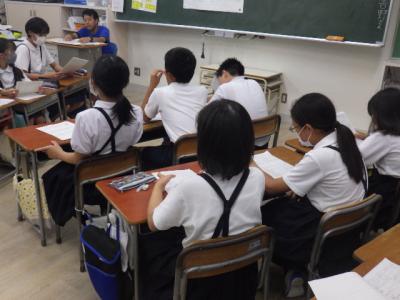 松任小学校では、年3回、道徳週間を設け、「思いやり」や「いじめの防止」について考えています。2学期の道徳週間は9月9日~13日でした。写真は、5年生の道徳の授業の様子です。担任が別の学級で授業をする「ローテーション道徳」を行いました。複数の担任で学年全体の子どもたちを見ていくことにもつながります。