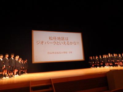 クレインで第1回白山ジオ学習交流会がありました。本校を含む市内の5つの学校がそれぞれのジオ学習の成果を発表しました。松任小学校は5年生が交流会に参加しました。本校の発表テーマは「松任はジオパークといえるかな⁈」です。庁舎や商業施設・住宅が多い松任地区は、山や海などの自然に囲まれる他の地域とは大きく様子が違います。そこで、1学期から、前述のテーマを設定し問題解決学習を行ってきました。見学や調査で得た事柄を、歴史・文化・自然の3つの視点で分析・考察し、発表しました。子どもたちは、「松任城、紺屋、油屋、伏流水、千代女・・・」など、松任の歴史や文化、産業の発展は、白山や手取川が作ってきたこの大地があったからだとし、「松任地区もジオパークなんだ」と結論づけました。発表の声もハツラツと聞き取りやすく、本当に素晴らしい発表となりました。5年生の皆さん、最高の発表でしたよ!!