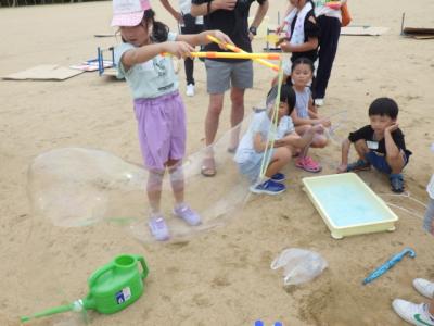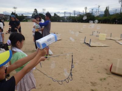 おやじの会の皆様の企画・運営による、恒例の「校庭キャンプ」が行われました。今年度は例年よりもさらににぎやかに、約170名の参加がありました。日中はシャボン玉づくりや、水鉄砲バトルがありました。水鉄砲バトルでは子どもも大人も水浸しになりながら大いに盛り上がりました。そして、夕食のあとは校庭キャンプ最大のイベント「学校肝試し(お化け屋敷)」です。おやじの皆さんの数々の仕掛けに、悲鳴を上げながらも最高に楽しめたようでした。校庭キャンプは、松任小学校の子どもたちを元気にする、学校自慢のイベントです。子どもたちにとっては、大人になっても忘れることのできない思い出になることと思います。おやじの会の皆様、準備から本日まで本当にありがとうございました。
