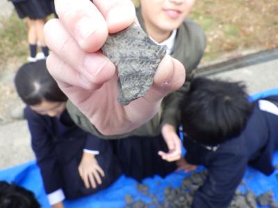 6年生が化石発掘体験を行いました。白山ろく少年自然の家の出前講座です。8名の方々にご来校いただき、地層や化石に関するお話を聞いた後、発掘体験に取り組みました。夢中になって化石を探す子どもたちでしたが、シダ類等の植物の化石がたくさん見つかりました。秋晴れの下、また一つ、貴重なジオ学習をすることができました。ご来校いただいたスタッフの皆様ありがとうござました。