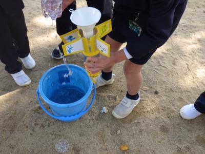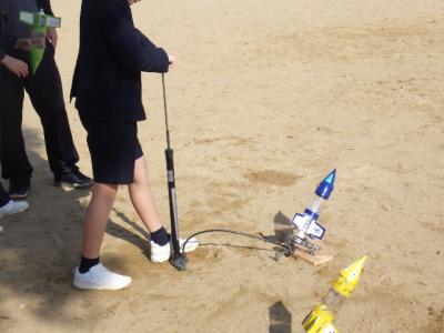 なかよし1の学級では、自立活動の時間に制作したペットボトルロケットを飛ばして楽しみました。上手くいくと「シュッ」という音を立ててとても遠くまで飛んでいきます。子どもたちは仲良く何度も挑戦を続けました。残念ながら、ペットボトルが飛んでいる様子は、速すぎて写真に収められませんでした。また、ペットボトルの真後ろで撮影していた校長に水が勢いよくかかった際には、みんな大笑いでした。子どもから「校長先生、体張ってるね」。ほめてもらえたのかな(笑)