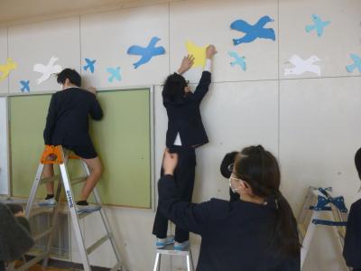 3月17日は卒業式の前日準備として、6年教室や体育館の飾りつけ、校内の掃除等、6年生のために一生懸命頑張る姿が見られました。
