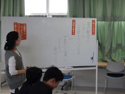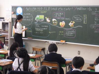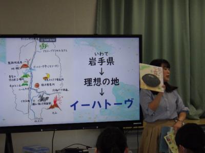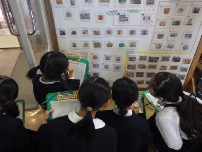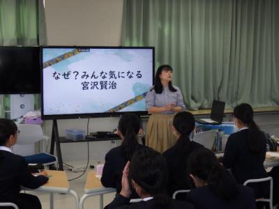 6年生の国語では宮沢賢治の書いた「やまなし」を学習します。そこで、「やまなし」に描かれた世界をさらに深く読むために、司書と担任がTTで「ブックトーク」を行いました。賢治の生き方・考えた方に触れるために、「注文の多い料理店」の序文をはじめ、「風の又三郎」「セロ弾きのゴーシュ」「銀河鉄道の夜」などの作品が紹介されました。そして、それらの作品に潜むポイント、「自然」「音(オノマトペ)」「わからない(?)」の3点に触れることで、学習への意欲を高めていました。著者や他の作品を知ることで、読みには深まりや広がりが見られることでしょう。「やまなし」をどのように読み表現するか、感性の高まりに期待です。