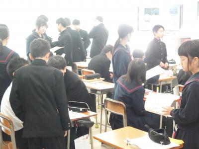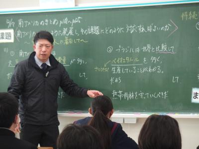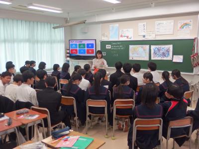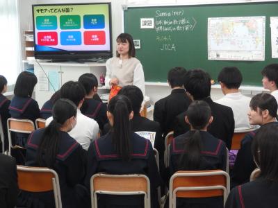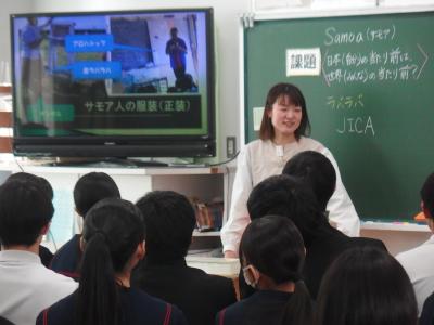 3年生の英語科では、国際理解教育も兼ねて、担当の先生がサモアでホームステイをした経験を元に、日本との暮らしや考え方の違いについて話しています。生徒は行ったことのないサモアに思いをはせ、興味深げに聞き入っていました。