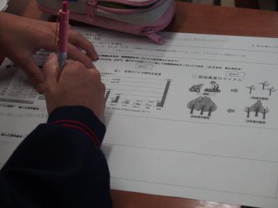 1年生の社会科ではブラジルの特徴的な経済発展について調べることを通して、南アメリカについて学んでいます。ブラジルではガソリンと主にさとうきびからつくるバイオエタノールを混ぜた燃料で走行できるフレックス自動車が普及しており、排出ガス削減や燃料輸入削減に貢献していることを資料集や映像資料から確認しています。