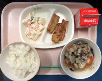 今日は月1回のジオパーク給食です。熊本阿蘇ユネスコジオパークにちなんで、熊本市民に愛されているソウルフードの太平燕(たいぴーえん)です。太平燕は中国福建省の郷土料理を日本の食材に置き換えてアレンジした麺料理です。野菜、海鮮、豚肉などの具材が入り、見た目はチャンポン、でも麺はヘルシーな春雨を使用し、あっさりしているのにコクのある味わい深いスープが特徴です。熊本に思いをはせて味わいました。