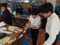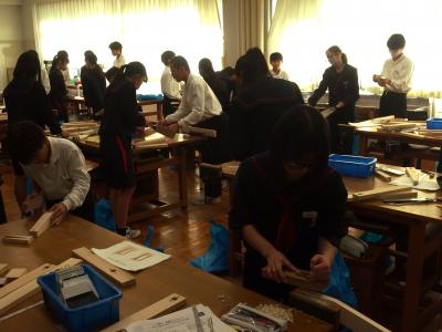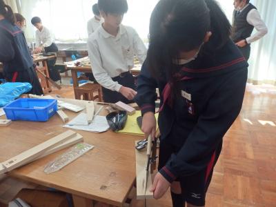 1年生の技術では、いす作りを行っています。設計図に従って木をのこぎりで切り、カンナを当てています。のこぎりやカンナを初めて使う人もたくさんいるようで、たどたどしい使い方に見ていてハラハラする場面もありましたが、けがなく作業を終えられたようです。