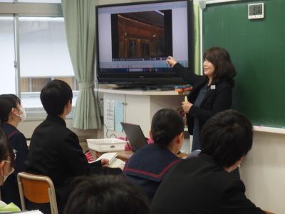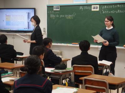 1年生の英語では、外国人に日本のことをもっと知ってもらうために、尊敬する人について紹介します。ALTの先生は、歌もギターも上手なアメリカ人歌手テイラースイフトを例として紹介しています。