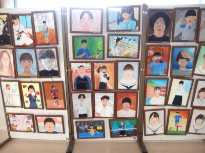 美術室前の廊下には、完成した自画像を掲示しています。個性豊かです。