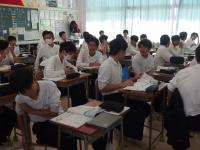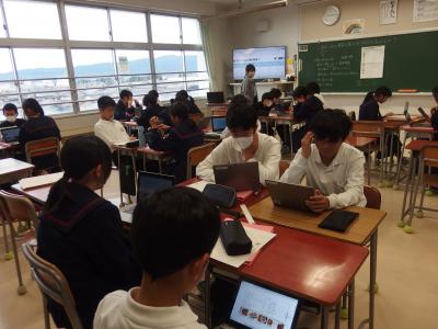 1年生は学年集会を行っています。昨日の合唱コンクールの頑張りについて、先生たちから改めて称えられていました。また、期末テストに向けて勉強に力を入れていこうという話もありました。家庭科では調理実習に準備をしています。豚肉の生姜焼きを作る際、生姜を荒く切るか、細かく切るかで食感や味がどう変わるかについて考えています。社会では、アジアがさらに発展するための各自の案を交流させています。例えば石油などの地下資源がとれる国では、油田近くに都市を形成し、人口を増やしていくプランなどが発表されています。