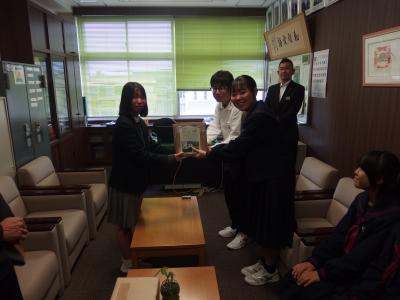 今日の昼休みに、公益財団法人日本教育公務員弘済会を通して翠星高校より、ようかんが贈呈され、本校生徒会役員が代表して受け取りました。このようかんは、翠星高校の上谷菊輪さんが、能登半島地震で3時間家の下敷きなり、その後も、水も食料もない苦しい避難所生活を経験し、栄養と水分が手軽に取れるおいしい非常食を作ろうと決意し、高校に戻って部活動の食品化学研究会で試行錯誤を重ね、金沢の老舗和菓子店の協力も得て、備蓄用非常食の「菊環羊羹」製品化に至ったそうです。今回、全校生徒・職員分の「菊環羊羹」約900個をいただきました。