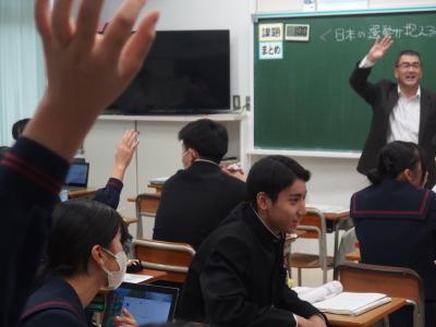 今日の教育実習生の授業は、指導案を用意して授業に臨むなど、これまでの実習の総仕上げとしての授業を行いました。日本の選挙が抱える問題について考える授業でした。一つの学習課題をいくつかのパートに分け、学習者それぞれが異なるパートを「専門家」として学び、その後にグループ内で教え合うことで、全体像を協力して理解するジグソー法という学習スタイルで学習を進めました。